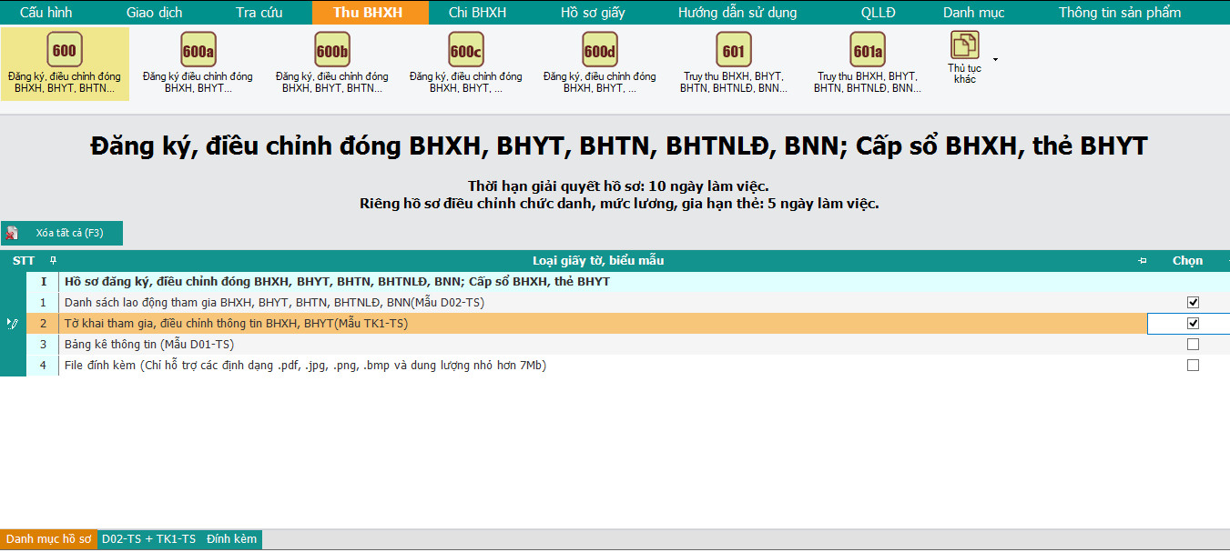 B3: Tại sheet “Danh mục hồ sơ” chọn tờ khai: D05-TS, TK1